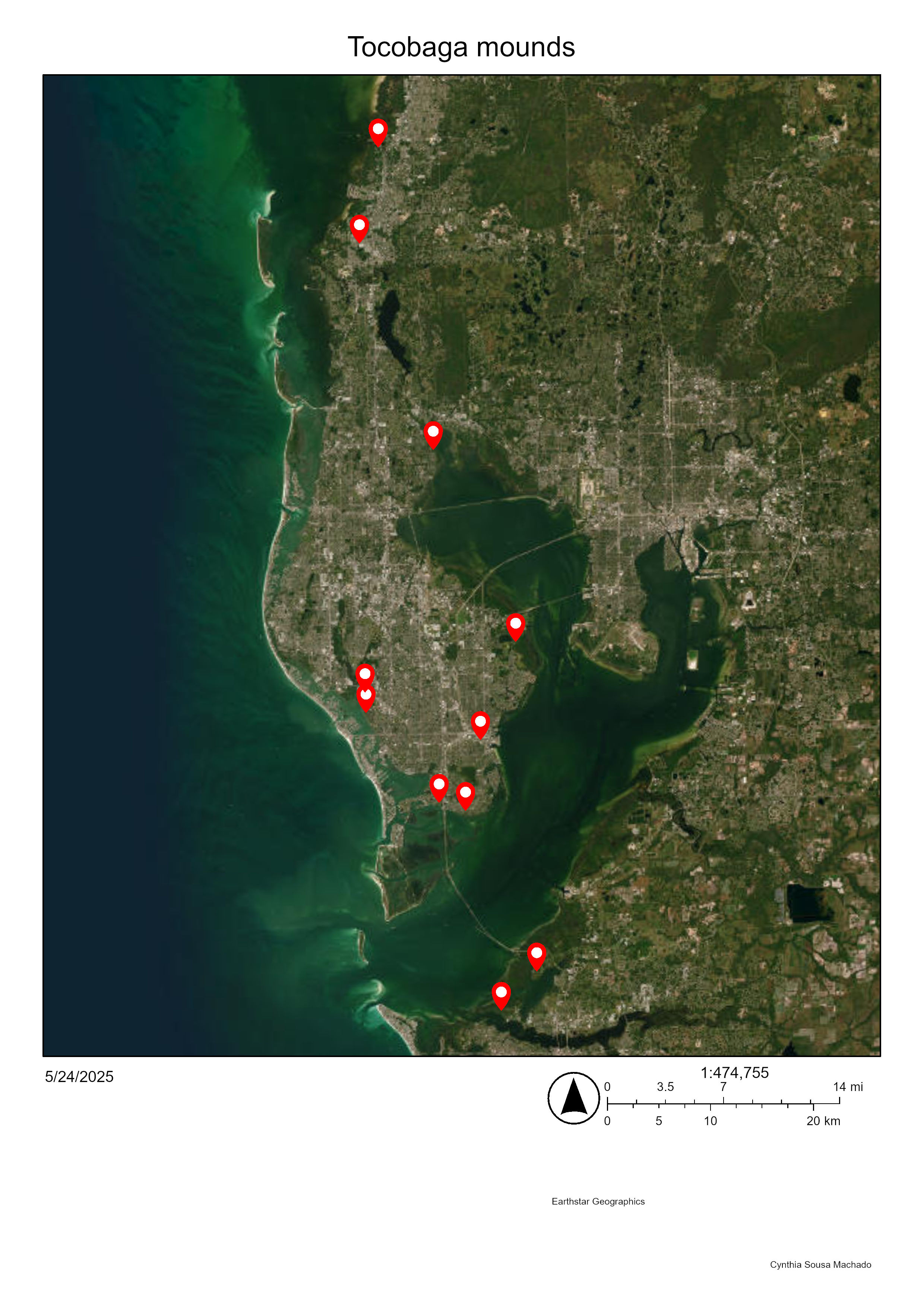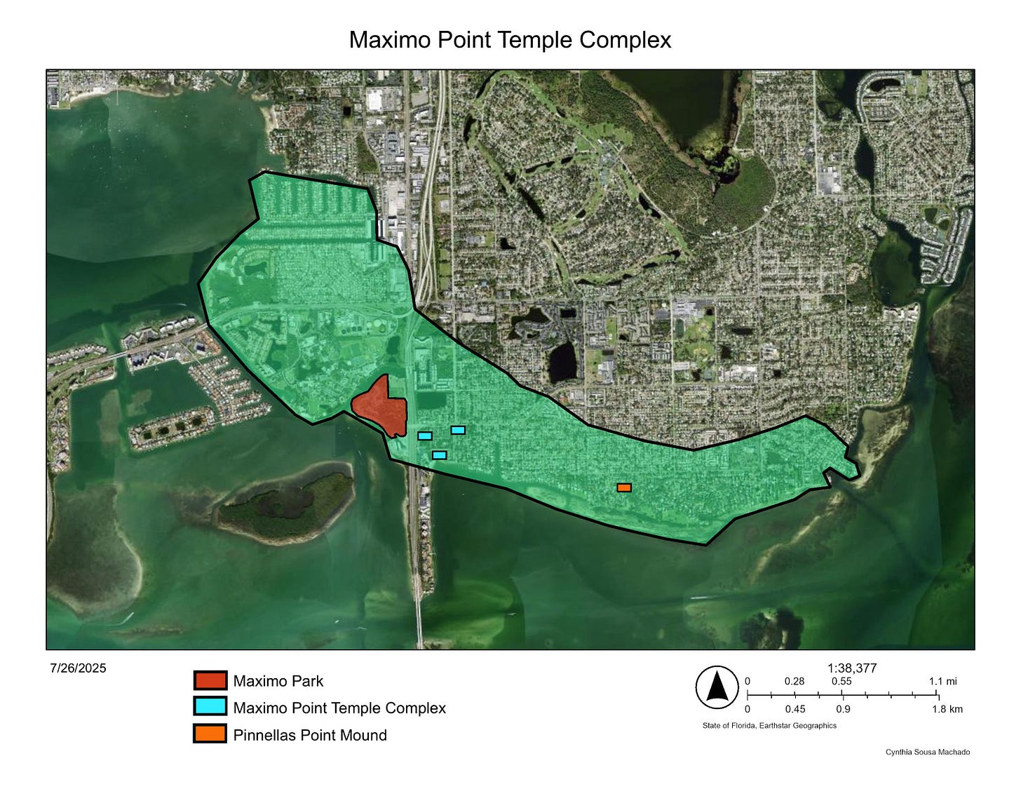 The area in red marks Maximo Park, our current research site. It sat in the middle of a three-mile stretch of the large Indigenous settlement. At 500, it's hard to say how developed these people were or if their settlement reached across the entire swath of territory we’ve indicated. The village and Temple mound (also called the Pinellas Point or Princess Hirrihigua Mound) seem to date to 900. By time it was constructed, the community had transformed considerably. Archaeologists describe the transition as developing from being Manasoto to a Mississippian-influenced culture. The shards of ceramics in Maximo, going back to 500, indicate a material culture with simple pottery, uniformity of diet, and likely social class. Ultimately, these people are descendants of the mound builder cultures in present-day Ohio/West Virginia, or more precisely, a local descendant like the Swift Creek in North Florida, Georgia and Alabama.