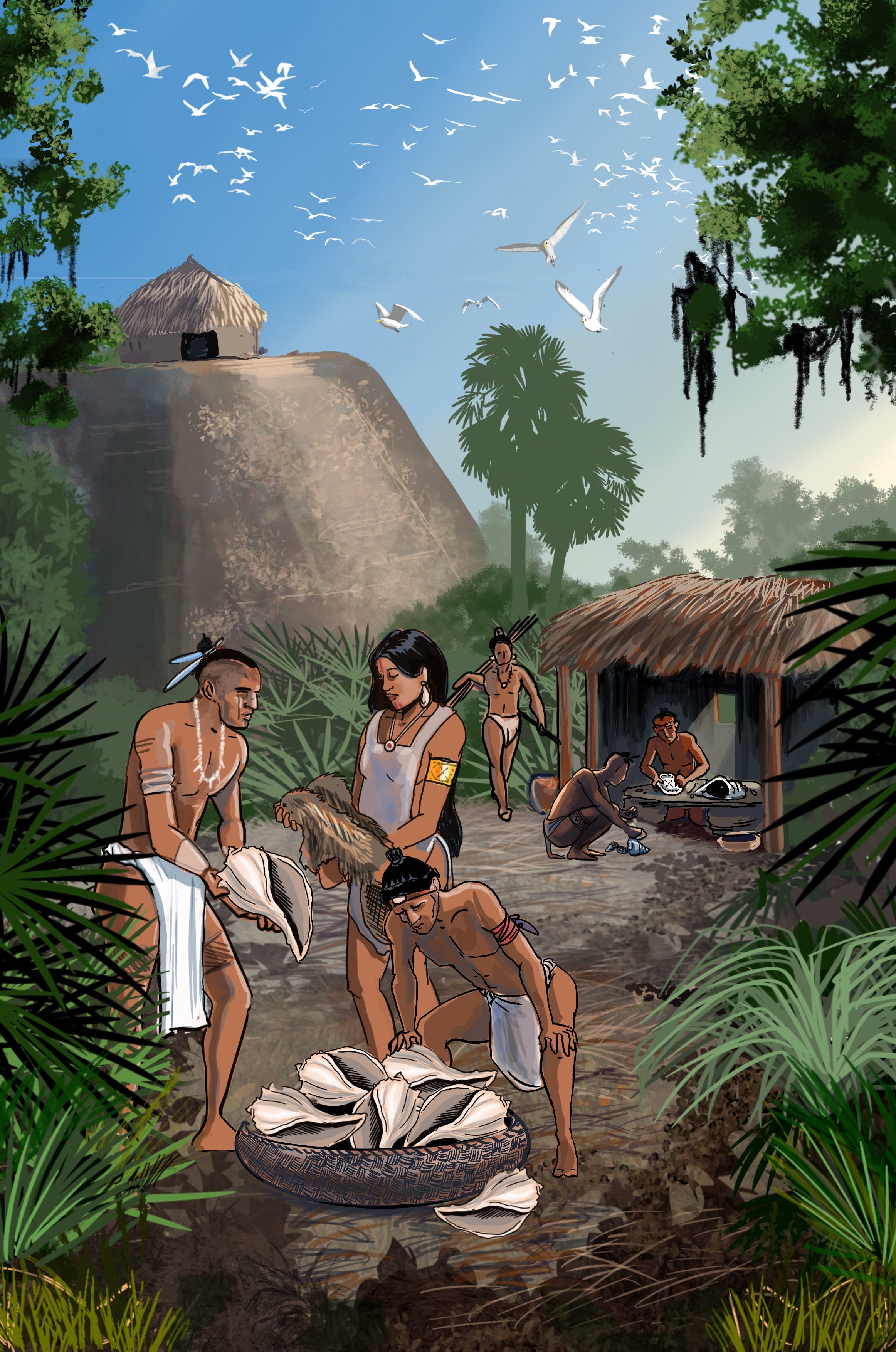At Pinellas Point, we see the remains of their temple mound upon which a Charnel House or perhaps the home of the community’s highest religious official sat. Stories conflict, and with limited excavations, we don’t have evidence to set them straight. However, we know they engaged in widespread trading with their neighbors from the many communities that inhabited Tampa and Charlotte Harbor to the south. Safety Harbor artifacts, like tools and shells, have been found in mounds belonging to other cultures. Further, the lightning whelk shells, traditionally used ceremonially to imbibe “the black drink” in many Indigenous American cultures of the Southeast, have been found as far north as Arkansas.